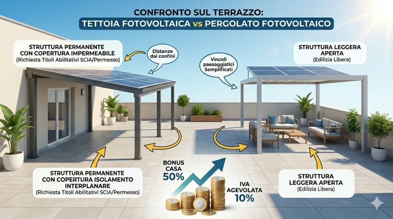 Sistemi su Terrazzi e Lastrici Solari: L'installazione di un pergolato fotovoltaico su un attico richiede la verifica del carico d'incendio e della stabilità strutturale del solaio, oltre al rispetto del decoro architettonico condominiale.